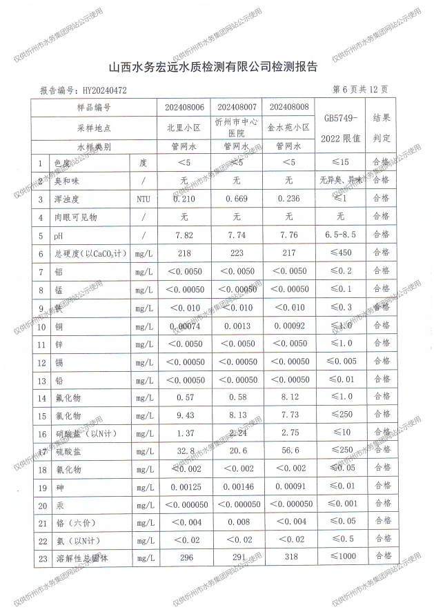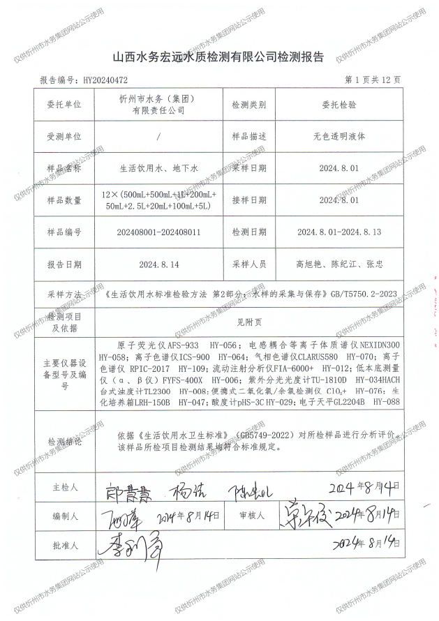 忻州城區(qū)公共供水水源水、出廠水、管網(wǎng)水、管網(wǎng)末梢水2024年8月份水質(zhì)信息公示